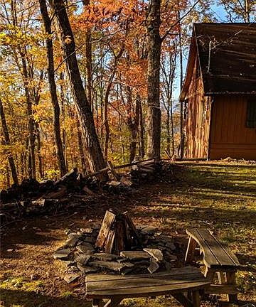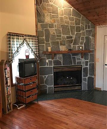 Sweet cabin in the woods with 2 beds and 2 full bathrooms, one on each floor. Vaulted living room stone accented fireplace; electric starter gas logs and heat blower. Rear deck with a great winter view that could become an enormous view by topping a few trees. Wonderful drive around driveway with large fire pit area and ample parking for guests. Great mountain community atmosphere with excellent road maintenance. Over 5 acres of privacy; this is a great home!