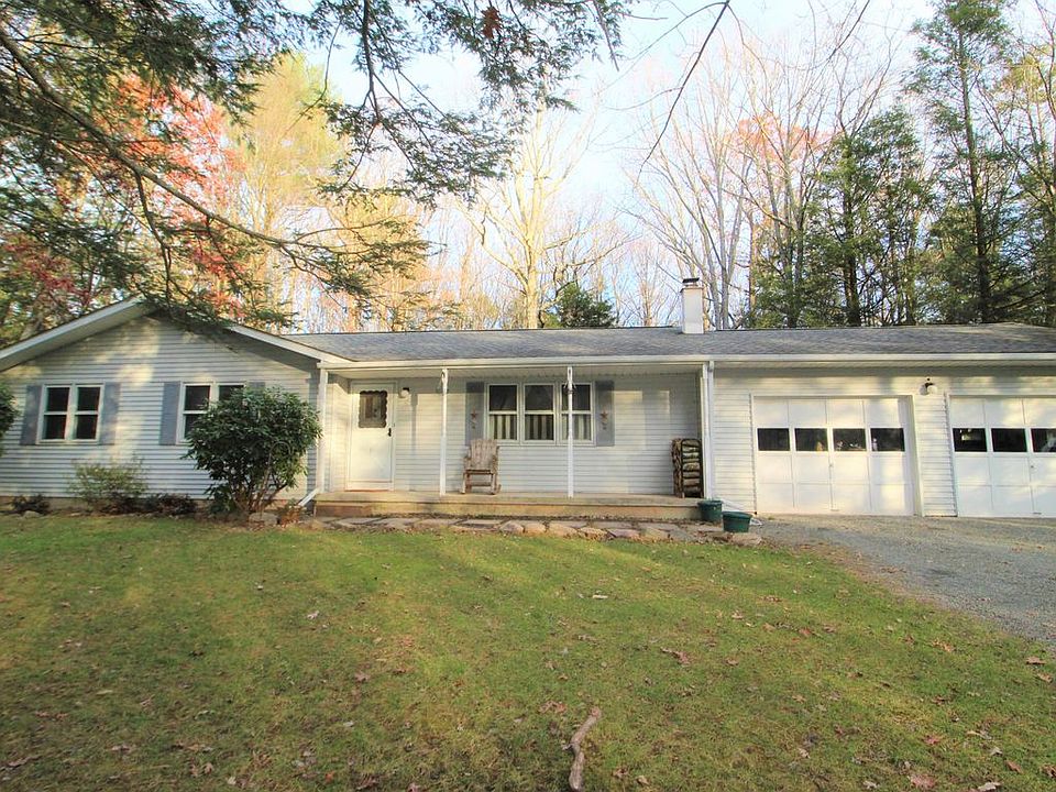 Your Home for the Holidays! Move in December. Spacious, well kept, with 3BD & 2BA on a beautiful acre lot. Roof is 10 years old but looks like new. Large newly renovated deck overlooks a patio and very private back yard. Large modern kitchen with lots of cabinets and room for a table. Next to kitchen is a spacious diningroom with a large bay window overlooking the rear yard. Livingroom has built in bookshelves on either side of the fireplace/ stove and room for multiple couches and chairs. Master bedroom has a nice tiled bathroom and large closet. Hall bath is also tiled. Full basement gives you plenty of room for storage, hobbies and playtime. The 2 car garage has room for two cars plus toys and lawn equipment. Then there is another finished and heated hobby room/ man cave off the gar