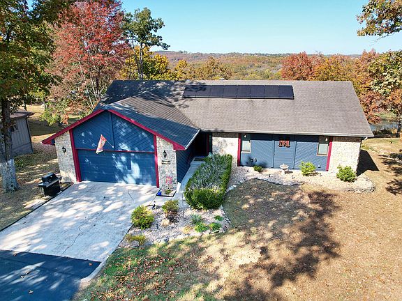 Discover your dream lake view home just minutes from Branson! This stunning 3-bedroom, 3-bath home features two stories with a walk-out basement from the den. Brand new Anderson windows throughout the house, including large picture windows in living room! Enjoy breathtaking views of Lake Taneycomo from the edge of a scenic cliff, while the remodeled large back deck, complete with a metal railing and built-in pergola, provides the perfect outdoor oasis for relaxation and entertaining. Looking for boat access? You are only about a 1 mile drive from Lake Taneycomo boat access, and about a 2 mile drive from Bull Shoals Lake. Enjoy abundant trout, catfish, bass, and blue gill fishing! All appliances, including a washer and dryer, are included, adding to the home's appeal. Also, the primary bedroom suite and laundry room are easily accessible on the main floor of the home. Step inside to find a beautifully repainted interior & exterior, enhanced by an abundance of windows that fill the space with natural light. The home boasts numerous upgrades, including new attic insulation, solar panels that are owned outright for significantly reduced electric bills ($98.23 is the current 12 month average!) The lower level includes a large workshop AND small workshop, large den, remodeled bathroom, and several closets and storage rooms, making this home not only a luxurious retreat but also a functional space for hobbies and projects. Be sure to see the home upgrades list & 3D tour for more!