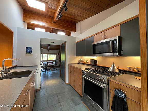 This magical & enchanting log cottage is tucked into the woods on nearly 4 pristine acres. Wilderness surrounds the landscaped lawn accented by craggy stone walls. Skylights & large windows flood the interior w/sunshine reflecting off bright white walls. A beautiful beamed cedar ceiling is complemented by engineered hardwood floors while exquisite architectural details like cable railings, finelyfinished wood trim, unique & custom storage are found throughout. Overlooking the great room the kitchen features custom built quarter hewn oak cabinetry, sleek stainless Bosch refrigerator & dishwasher, KitchenAid gas range w/convection oven & microwave and stunning large scale Spanish porcelain tile counters with slate floors. Exquisite bathrooms offer the finest in materials and fixtures with storage hidden behind mirrors. Both a soaking tub and stunning custom showers await and a Swedish sauna invites relaxation. Treasures are everywhere you look. A spacious family room carpeted with commercial carpet tiles, a library with hidden desk feature, two fireplaces for added warmth, a large laundry with huge built in sink plus storage cabinets, amazing store room and what is now utilized as a craftsman's workshop, all await you in this special home. The property has been mitigated from fire danger with dangerous trees removed & a small shed to store flammables built away from the house. More precise details can be found under Documents in the Sellers' Property Disclosure with a complete list of upgrades. A long private paved circular driveway leads you here surrounded by stone walls and natural beauty wherever you look. Bounded by Little Rabbit Creek with the majestic Chugach Range in the near distance you will sense a serenity missing in our typical neighborhoods. Let the gated covered entryway protected by a half wall of logs with unique custom lighting welcome you home to this slice of Alaska within our city limits.