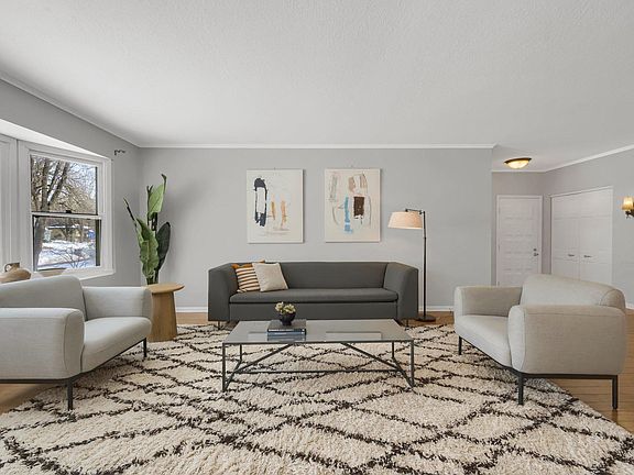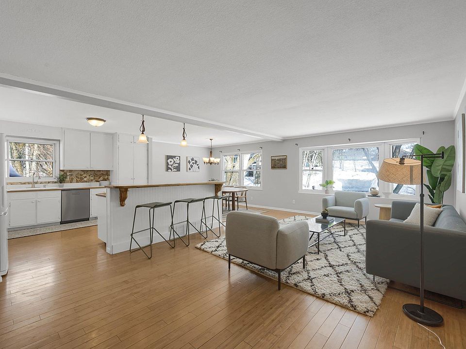 This Minnetonka home situated on a corner lot is ready for its next homeowners. Unlike many split levels, this spacious and inviting open concept kitchen, dining and living room welcome you right in from the main floor and attached garage entrances. There are 2 bedrooms upstairs, including a large primary with walk in closet and ensuite bathroom and powder room. The lower level also has 2 large bedrooms, a 3/4 bathroom, a 1975 great room complete with brick fireplace, wet bar, original parquet flooring, AND a garden facing sunroom that walks out to the deck, garden and pond views. The fourth and final basement level has been recently finished for bonus recreational space and storage. New roof in 2020. New garage door in 2023. Fresh paint and new carpet have made this excellent home move in ready - with easy equity building opportunity in this highly desirable neighborhood close to nature, schools, parks, and all of the best of Minnetonka, Eden Prairie and Hopkins!