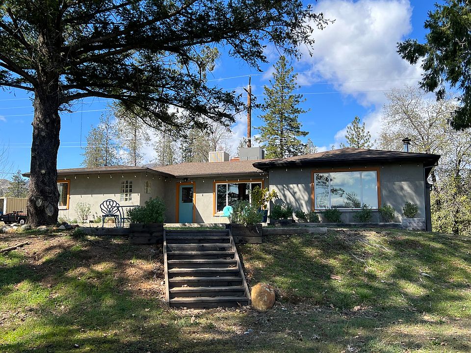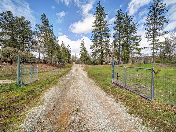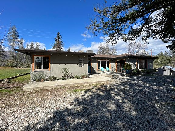 Immaculate Mid Century Home with fir floors, granite counters and island, stainless appliances, newer double paned windows, and a big patio on a grassy knoll overlooking 5 acres of land with a creek running through it. This beautifully remodeled home is move in ready with fresh interior paint, wood and beam ceilings, a large living room with slider to patio, and set way back from and above the road with lots of privacy, gated entrance, open space, and views. Many extras with this property, including a new full size 20 foot cargo container permanently installed for storage, two sheds, fencing, central heat and air conditioning, ATT high speed internet, and backs up to BLM land for privacy. Owned by a local physician, extremely clean and well maintained.