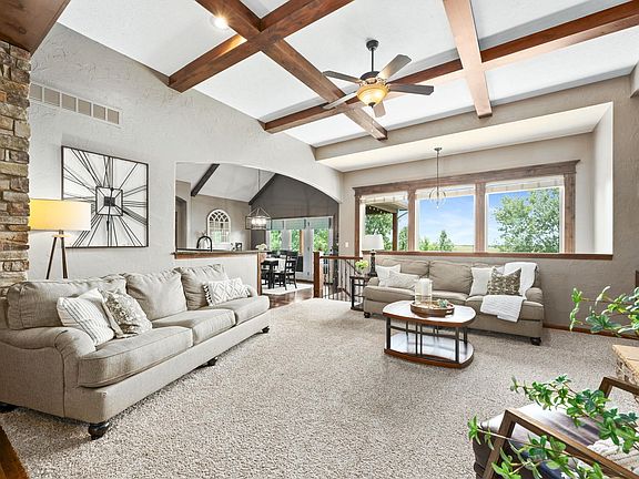 This stunning former model home, built by Craig Sharp Homes, is a rare find in the highly coveted Monarch Landing. With Wichita taxes and Andover schools, it offers a perfect blend of convenience and luxury. The five bedroom, three-bath ranch spans 3,052 sq. ft. and features and open floor plan with large, airy windows, 11' beamed and vaulted ceilings, and a gas stone fireplace surrounded by gorgeous wood-built ins. The kitchen is breath taking with Hickory wood floors, knotty alder cabinets, and a custom hood. It includes bar-top dining, granite surfaces, a walk-in pantry, and a family dining room that leads to a covered oversized composition deck overlooking a private yard. The home has a split bedroom plan, with a Master Suite featuring a separate tub, shower, and large walk-in closet. Two additional bedrooms and a full bath are located on the east side of the home. Descending the stairs, you'll find a mid-level walk out leading to beautifully landscaped grounds with a large patio, edged with red brick, wood fence, sprinklers, and a well. The spacious family room includes a large stone fireplace, view-out windows, and a custom wet bar with a mini fridge, game table area, and a charming hidey hole under the stairs. The basement also has two additional bedrooms and a full bath. An oversized three-car with shelving completes this exceptional home.