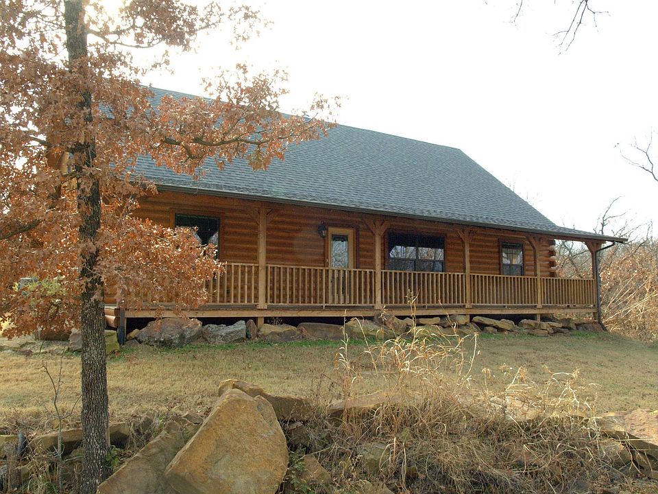 Beautiful log cabin on approx. 2.5 acres (m/l). Full covered porches. Detached 2.5 car garage/workshop heated & plumbed. 3 car attached garage. RV/Boat parking. Full basement with built in storage. Close to Lake Bixhoma.