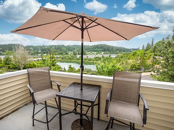 The Best unit in all of Progress Ridge! End unit lives like a detached home with expansive views of Progress Ridge Lake, Mt. Hood and diverse trees nestled on the other side. Kitchen is top-flight with ultra custom high end bamboo cabinets, granite counter tops and movable prep island. Custom trim, built-ins and closet doors on the main level completed by a craftsman. Flooring with alder trim. Gas fireplace. Oversized 2 car garage with deep storage in the back and a separate entrance that takes you straight out to the action of walking trails around the lake and quick access to Progress Ridge shopping which includes over 5 restaurants, New Seasons, La Provence, Big Als, and AMC movie theater. Sought after schools in a prime area. Guest parking steps from the unit. Check out this cherry bomb right away!