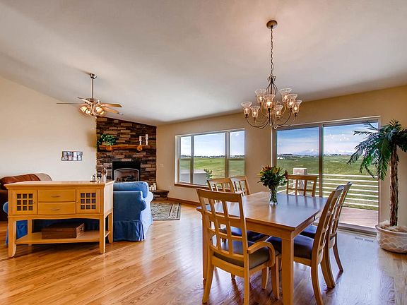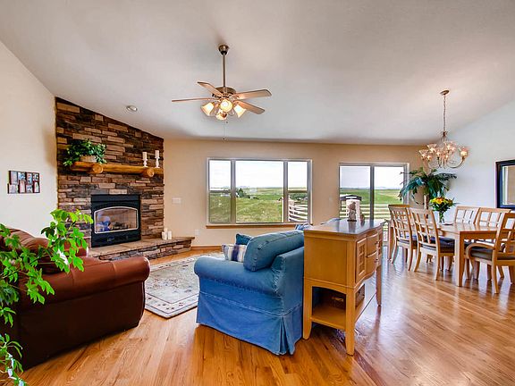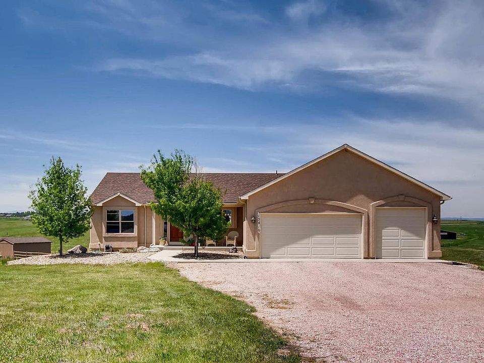 Main Level Living! Beautiful Stucco Rancher With A Finished Walk-Out Basement On 5 Pristine Acres With Unobstructed Mountain Views Including A Picture Perfect View Of Pikes Peak From Both Inside & Outside...Zoned For Horses, Fenced, And A Gently Rolling Level Lot That Includes A 50 x 30 Detached Shop/Garage, This Well Maintained Property Is Impressive...Inside, The Main Level Features A Bright And Open Floor Plan With Gleaming Hardwood Floors, Vaulted Ceilings And A Generous Great Room With A Gas-Log Fireplace...The Open Kitchen Features A Cozy Island, Stainless Appliances, 6 Burner Gas Stove, Granite Tile Counters, Lots of Cabinet & Counter Space And A Generous Breakfast Bar...The Open Dining Area Walks Out To A 24 Foot Trex Deck; A Perfect Place To Watch Colorful Colorado Sunsets Over The Mountains...The Generous Main Level Master Suite Includes A Gas-Log Fireplace, 5 Piece Bath, Soaking Tub, Walk-In Closet, & A Walk Out To The Back Deck & Mountain Views...The Laundry Is Conveniently Located On The Main Level As Is The Office, Guest Bedroom, & Guest Bath...Downstairs, The Huge Walk-Out Family/Rec Room Includes A Pool Table, Fireplace, And Plenty Of Room To Entertain, Watch Movies Or Relax With Family & Friends...Also Downstairs Are Two Additional Guest Bedrooms, A Guest Bath & Tons Of Storage...Just Outside Is A Beautiful Flagstone Patio Designed To Be Used Day Or Night With A Custom Pergola, Built-In Fire Pit And Ambient In Wall Lighting Around The Perimeter...Additional Features Of This Well-Maintained Home Include 9 Foot Ceilings In The Basement, Central A/C, 3 Car Attached Garage w/An 8 Foot Door & Epoxy Floor, A 50'x30' Outbuilding/Shop w/ A Concrete Floor, Wood Stove, Air Compressor, & Plenty Of Room For 3+ Cars...Located In The Desirable Terra Ridge Community And Academy School District 20, With Paved Roads To The Driveway, & Easy Access To Peterson, Schriever, And The Academy, Just Minutes To Colorado Springs Or Monument...Don't Miss This Opportunity!