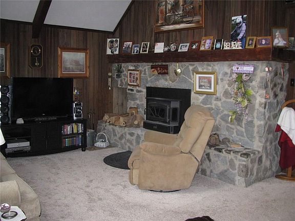 Chalet style, one-of-a-kind home, on 11.424 acres of wooded acreage with pond.First floor: Entrance with mud room, large closets and laundry area, 2 bedrooms, full bath(w/crawl entrance in closet) , large eat-in kitchen and spectacular living room with floor to ceiling, wood-burning, stone fireplace and cathedral ceiling. Living room has two walk-out sliding doors and kitchen has one walk-out sliding door, all Anderson custom doors. Living room windows have six sets of custom-made blinds. Appliances include range/oven, refrigerator & dishwasher. Spiral staircase to master suite. Large bedroom with private balcony & walk-in closet,full bath and loft area with fireplace & built-in wood shelves. Home has propane forced air heat and electric baseboard heat. A/C and whole house Generac generator(2015).All flooring, ceiling fans and baths, new in 2018.Original, one bedroom "Bunk House" with full bath & kitchen, separate meters, for "Summer Fun". Barn, and 2 sheds plus stocked pond. Sump pump