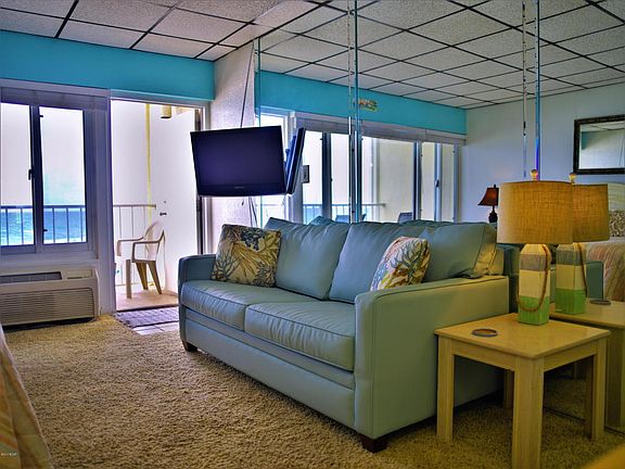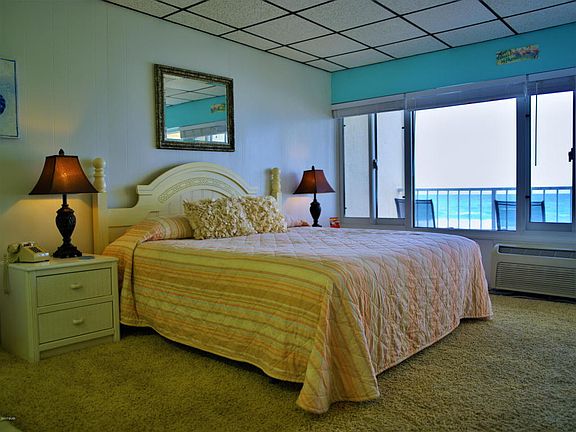 Rare...don't miss your chance at affordable Gulf front living under $115,000! This studio efficiency features a full kitchen, full bath, a King bed, sleeper sofa, dining table, and accommodates a family of four! Fantastic sunsets from your private Gulf front balcony. Prime location only a short walk to the City Pier, Pier Park, theaters, dining, shopping, family recreation, across the street from Gulf World, and only 18 minutes gate to door from the airport. Amenities include a seasonally heated pool, Tiki snack bar, lounge/game room with pool tables and kitchen, laundry, 24 hour security, onsite rental management and covered parking. Additional monthly fees $15 phone, $45 for cable & Wi-Fi, security $23, utilities $132.50 base rate plus $2.99 per day of occupancy. Optional TV lease $10.