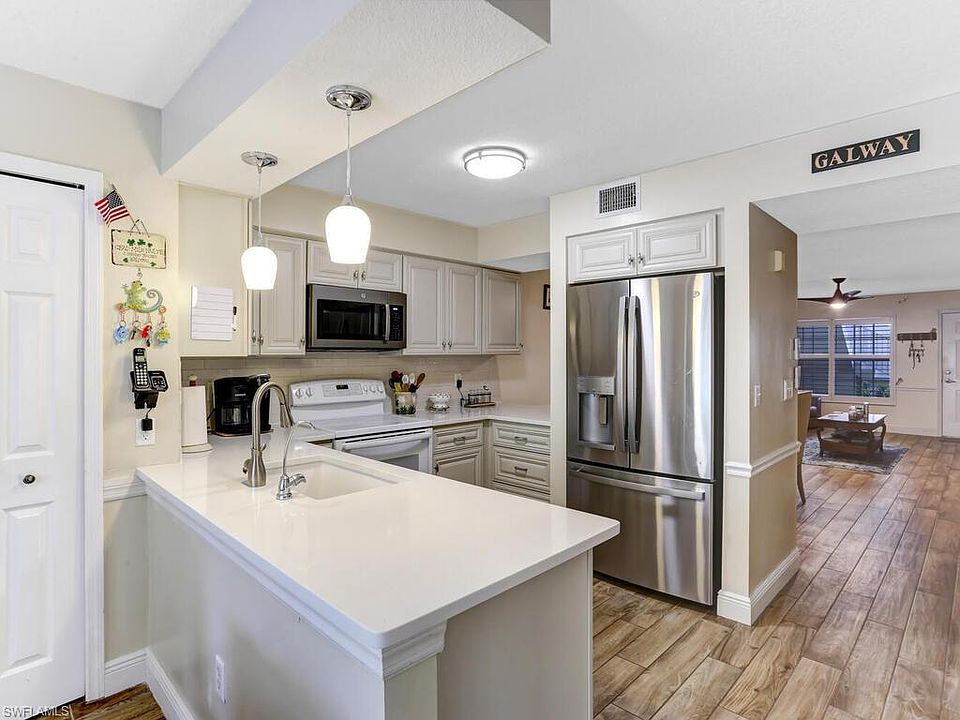 Florida living at its finest. Bay Forest boasts 150 spectacular acres of natural preserves on the backwaters of the Gulf of Mexico with more than 2 miles of walking paths, minutes from Delmar Wiggins State Park and Barefoot Beach. Bermuda Bay is at the heart of this amenity-rich community including swimming pool, tennis and pickleball courts, a fitness center, and much more as well as several planned activities throughout the year! You'll fall in love with this spacious 2 bedrooms plus den, 2 bathroom 1538 square foot condo boasting a 1 car garage. This home flows beautifully from the open living/ dining area with gorgeous wood-plank tile flooring, into the roomy eat-in kitchen with striking white shaker cabinets and subway tile backsplash. The extended portion of the kitchen has plenty of extra storage with a built-in island/breakfast bar with granite countertop and a wall of contrasting cabinets adding an air of sophistication. The generous master bedroom suite allows access to the private lanai and features a walk-in closet and nicely appointed bathroom. A guest bedroom and bath round out this charming home.