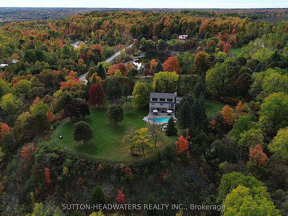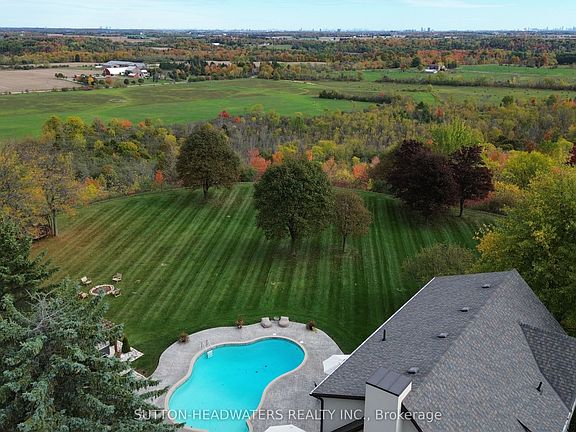 Welcome to GRANDVIEW ESTATE! This is the property you've been waiting for. Discover a rare gem with jaw-dropping panoramic views that will leave you speechless! Nestled just minutes from Georgetown, Go-station, and many prestigious Golf Courses. This extraordinary estate sits on over 5 acres of breathtaking, pristine landscape. Perched atop the Niagara Escarpment, it offers unrivaled vistas of the Toronto skyline, the iconic CN Tower sparkles in the distance a sight to behold from dawn to dusk. This one-of-a-kind home, meticulously renovated with designer flair and no expense spared blends luxury with natures grandeur. The open-concept main level dazzles with a gourmet kitchen featuring a GE Cafe 6-burner gas range, Sub-Zero fridge, travertine and hardwood floors, crown molding, a stunning decorative fireplace, and pot lights. Multiple walkouts showcase 360-degree views, immersing you in the serene beauty of the surrounding conservation land. A stunning concrete freeform pool with patterned concrete patio and stand alone spa elevates outdoor enjoyment to new heights. Upstairs, four spacious bedrooms, including a recently renovated primary suite with a lavish ensuite and a private balcony overlooking paradise. The fully finished third floor is a showstopper, featuring a cozy fireplace and extraordinary, unobstructed views that elevate every moment spent in this serene retreat. The lower level impresses with a cozy recreation room, possible +2 bedrooms featuring another gorgeous fireplace, and a sleek 3-piece bathroom. Perfectly positioned near charming Glen Williams and backing onto protected conservation land, this home is a sanctuary of luxury and tranquility, where unparalleled views steal the show. 3 Gas fireplaces/on demand Generac generator/Geothermal/400 amp service.