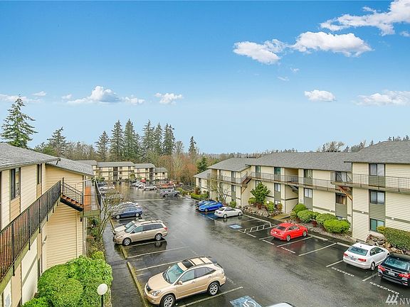 Top floor unit with southern facing exposure. Two designated parking spaces belong to this unit, including one covered spot. Gorgeous unobstructed sunset views from front deck space, and peek-a-boo views of the Olympics in the back. 1,128 sq ft with circular floor plan. 2017 water heater along with 2020 kitchen appliances (range, dishwasher and refrigerator) and 2020 washer/dryer combo. Tons of storage space with two large pantries. Mantle fireplace in living room, large dining room with serving counter to kitchen. Master bedroom has 3/4 bathroom. Complex has swimming pool, sports court, play ground & meeting room. Easy to Hwy 99, I-5, Boeing. No rental Cap, two pets, max 40 pounds.