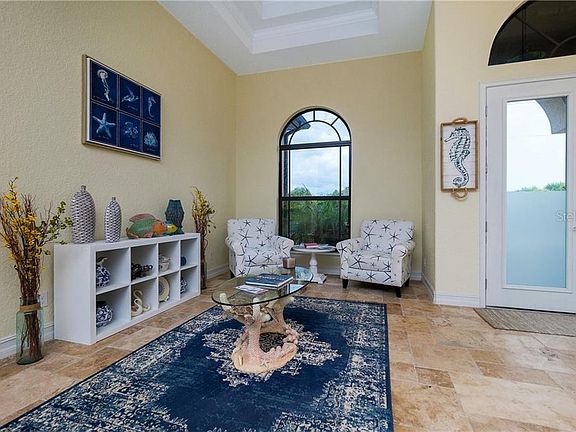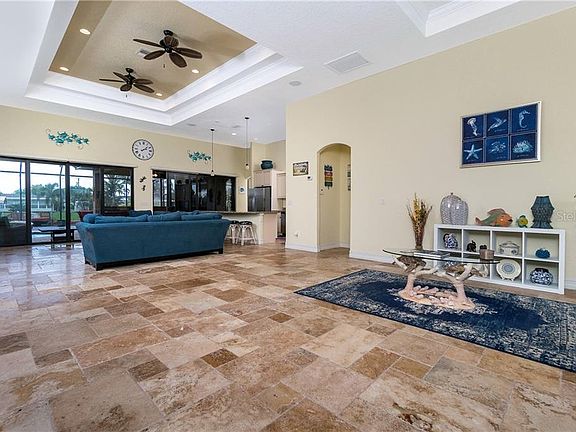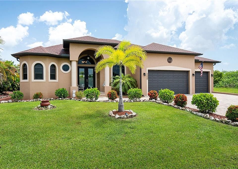 Exquisite custom built 2,502 sq. ft. 3-bedroom, 2-bathroom, pool/waterfront home located in the much sough-after South Gulf Cove neighborhood. Great opportunity to own this beautiful home with 84' of waterfront on the Zephyer Waterway with access to Charlotte Harbor and the Gulf. The moment you arrive at this elegant home you will begin to appreciate the upgrades beginning with the stunning landscaping with outdoor lighting and brick paver driveway/walkway. Luxury glass double entry doorway opens to the great room with 8 ft. sliders leading out to the Pool/Lanai giving you the feeling of bringing the outside in. Showcasing soaring ceilings, decorative tray ceilings with crown molding 5 1/2" baseboards, Travertine stone flooring, surround sound and so much more. The custom kitchen is a chef's delight with soft close wood cabinetry, granite counter tops, 10' island/breakfast bar w/ vegetable sink, stainless steel appliances including gas stove. Master suite has sliders out to lanai, tray ceiling, 2 huge walk-n closet, extended granite counter-top vanity with his/her sink, soaking tub and gorgeous walk-thru shower with dual shower heads and bench. Two guest bedrooms are sure to please family and friends along with stylish full guest bathroom. Let us not forget the spacious office/den, also with Travertine and sliders to pool/spa/lanai. Outside is an entertaining delight with fabulous views of the canal, heated pool and attached hot tub, Summer kitchen featuring granite top bar that fits 6 stools along with built-in Blackstone Adventure Ready grill, sink and storage. Brick paver patio and screen enclosure extended in 2018 adds additional outdoor space. Step outside to another patio area for full sun and fun. 50' cement dock with water/electric, 50-amp electric for future boat lift and fish cleaning station. Extended driveway provides additional parking. Home also features inside laundry room, remote battery-operated shade in great room, kitchen and master, 3 car-garage with workbench and shelving for additional storage, and so much more. The South Gulf Cove Community is known for its fishing and close to the golf courses. Plenty of shopping, dining, entertainment, and beaches nearby.