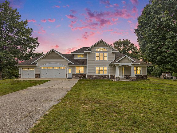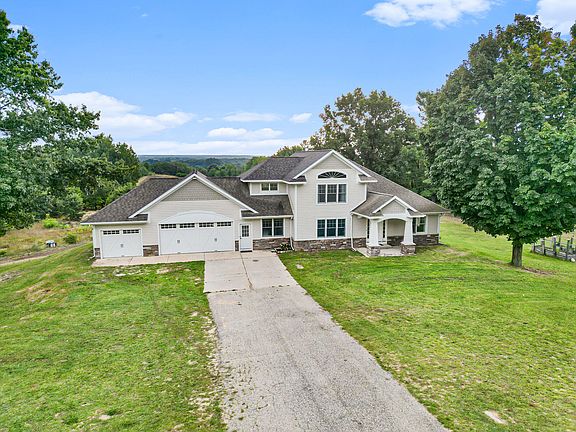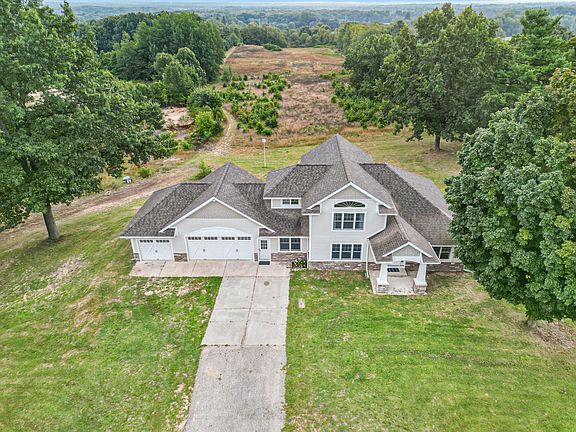 This custom-built, five-bedroom home is nestled on a serene nine-acre property, offering both space and tranquility with incredible sunrises. The gourmet kitchen is a standout, featuring a large island, tons of cabinetry, stainless steel appliances and a convenient pantry. The dining area opens to a spacious deck through sliding doors, providing beautiful, peaceful views of the surrounding landscape. The main floor includes a welcoming living room with lots of natural light, a large mudroom, the laundry room, 2 nice sized bedrooms, and 1.5 baths. Upstairs, the private primary suite boasts vaulted ceilings, along with its own living area, a spacious walk-in closet, an en-suite bath with a whirlpool tub and a walk-in shower. The finished walk-out basement extends the home's living space wi a family room, 2 additional bedrooms, and 1 full bath. Other highlights include a three-stall garage with a 30 amp plug-in for RV, etc., closed-cell spray foam insulation, James Hardie siding, a high-efficiency zoned furnace, hardwood floors, a pre-installed wood burner connection and lots more. This residence combines modern convenience with timeless elegance, offering a perfect blend of luxury, functionality, and serene country living while still being within 30 minutes of Grand Rapids. Schedule your showing today!