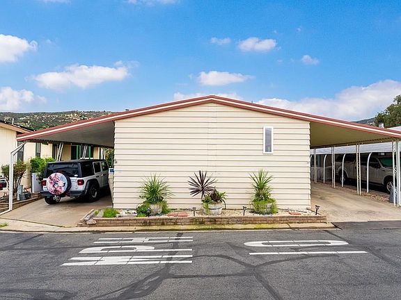 Sweeping mountain views define this beautifully updated home, ideally situated on a premium lot within a scenic 55+ community that is also VA approved! This home offers the rare benefit of NO SPACE RENT and a low HOA of just $318 per month, which includes water, trash pickup, cable, ample guest parking, and access to an impressive list of amenities. Energy efficiency is a standout feature with 17 owned solar panels, helping keep utility costs low. The interior has been tastefully renovated, including newer laminate flooring throughout with no carpet. Two bay windows at the back of the home bring in abundant natural light while framing the mountain views. the home offers a well-designed layout with a welcoming living room, a spacious family room, and a formal dining area, creating excellent separation of spaces for relaxing and hosting. This home features fresh paint, central AC and central heating. A bright sunroom provides additional flexible living space, and a large laundry room includes a full-size washer and dryer. Interior improvements create a clean, finished feel that lives comfortably and flows well. Outside, the property includes a newer roof installed in 2021, seismic bracing beneath the home for added reinforcement, two covered driveways with one on each side of the home, fruit trees and an additional storage shed or workshop area. The scenic back patio opens directly to green space and panoramic views and is just steps from the community amenities. The surrounding hills create a peaceful backdrop throughout the neighborhood, with especially stunning views from the home itself, including the back patio and interior living spaces. Residents enjoy a resort style lifestyle with a heated inground saltwater pool and spa, two fitness centers, pickleball court, shuffleboard, dog park, car wash, optional RV parking available for an additional fee and more! The location offers a peaceful country feel while remaining just minutes from the 8 freeway, shopping, dining, and all daily necessities. This is a must see!