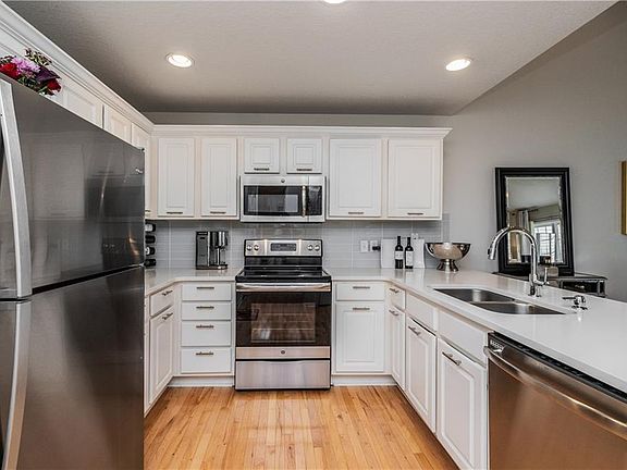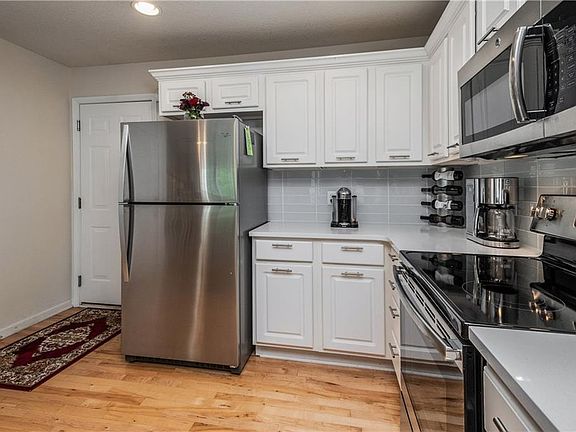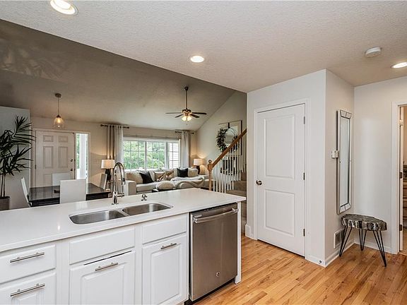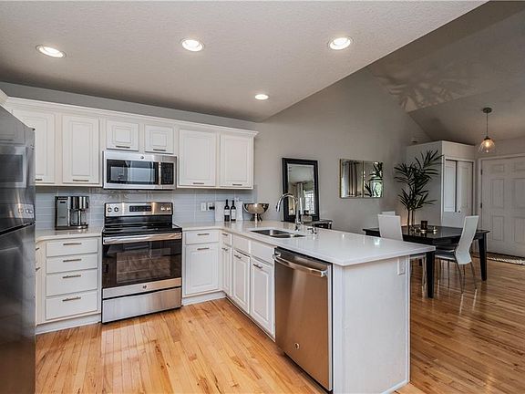Step in & feel right at home! Beautiful white kitchen with classy subway tile, sleek white quartz, stainless steel appliances, new faucet, cabinet pulls, plus canned lighting & spacious breakfast bar. The maple hardwood flooring flows from the kitchen into the vaulted dinette & cozy family room. Also, enjoy tons of natural light from the triple glass patio doors. The 1/2 bath with new faucet and tile flooring round out the main floor. Up you will find the master suite with private 3/4 bath, tile floor & walk-in closet. You will also find bedroom #2, a full bath and laundry. Don't miss the fresh paint, 2-car attached garage, LL ready for your finish, and the location to walking trail and school.