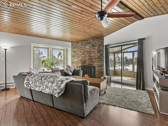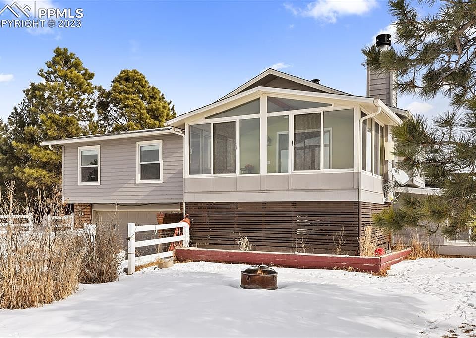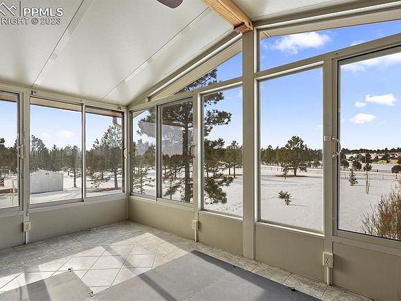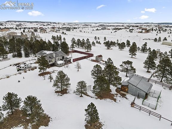 Stunning remodel on this one of a kind Black Forest property! Gorgeous Bi-Level home on 5 acres with lush meadow and trees. Entry is fresh with new iron railing. Main level is breathtaking with so much light and views in every direction. Living room has vaulted wood plank ceilings, Pergo flooring, wood burning fireplace and additional living space with the huge Sunroom. Views surround from the massive windows, perfect for gardening, plants or reading. The kitchen is a DREAM with custom cabinets, recessed lighting, pantry, newer Stainless appliances AND white Quartz counter tops with Granite sink. Ceramic tile floors with adorable dining area that walks out to the freshly painted wood deck. Weber grill with piped in gas is included as well as the views while you are grilling! Main bedroom has it's own private deck and an attached bath that most only dream about. Slate walls, huge soaking tub and glass tiled shower both with views out of the large window. 2 other bedrooms on this level along with the additional custom bath with tiled shower and barrel sink. Lower level is a huge space with family/rec room with new flooring and a wood burning fireplace and second sunroom. Lots of room for additional bedrooms if needed. Lower bath has been remodeled to a custom dog wash! Easily converted back if needed. Walk out to large privacy fenced backyard. Adorable chicken coop for your own fresh eggs! 2 storage sheds also included. The whole property has invisible fence and has 4 separate pasture areas. Very nice 2 stall barn with mats and pipe corrals with crushed stone footing, automatic waterers, cement aisle, electric/water and wash area. Equestrian friendly community with riding easements as well as walking/biking trail system. Property is turn key and has a park like setting with beautiful views in every direction. Located on a corner cul-de-sac with white vinyl fencing this is really a special retreat. Easy commute to Colorado Springs or Denver.