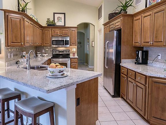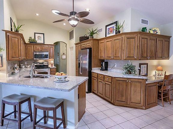Charming 2 Master Suite Topaz located on a cul-de-sac lot within walking distance to the Eagles Nest amenities. Updated kitchen (2004) features new cabinetry, roll-out shelves, GRANITE counters, tile backsplash, Stainless Steel Appliances, & undermount stainless sink. Two large master bedrooms; both with updated (2013) en-suite bathrooms featuring new cabinetry, dual undermount sinks & granite counters, large walk-in showers with tile shower surrounds, high quality glass shower doors, & walk-in closets. Plantation Shutters throughout. Spacious laundry/hobby room with abundant cabinetry & counter space; Washer & Dryer stay! Extended length 2 car garage with golf cart parking area & storage cabinetry. Lovely curb appeal. Large back patio area for relaxation or entertaining. Move in Ready!