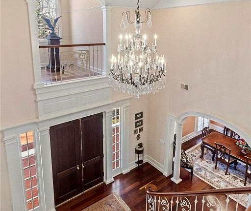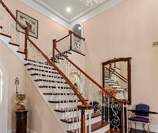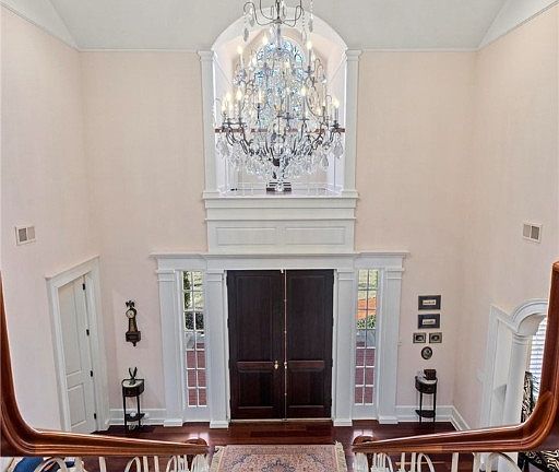 - Description: Large foyer with a beautiful chandelier and custom split staircase.,Flooring: Wood