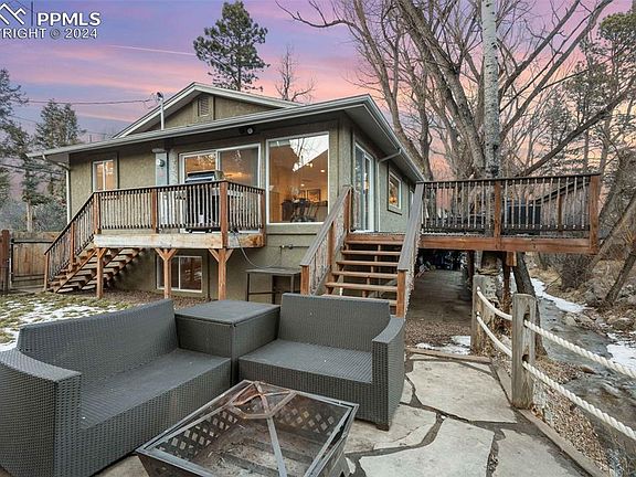 Welcome Home to Cheyenne Canyon! This truly unique property that features a 6400 square foot lot that FULLY backs to Cheyenne Creek! Enjoy the sounds of running water year round, as well as walking access to all of the wonderful outdoor amenities that the Canyon provides! The backyard is completely fenced and protected from your deer neighbors, but you'll still see them plenty hanging out at the creek. The Home is designed to take full advantage of this- with a huge composite deck (you have access to this from the Great Room, Master Bedroom, or Main Level Study!) and lower patio that makes for a great fire pit hang out. The Exterior of the Home features beautiful stucco, as well as copious parking- a rarity in the Canyon! There is an additional spacious composite deck off the front entry, that will lead you into a wide open floorplan that features a two-sided wood burning fireplace as the magnificent centerpiece. The Main Level also features gorgeous and durable Luxury Vinyl Flooring, and a fully remodeled Kitchen that features two-tone quartz countertops and a stunning center island. There is spectacular natural light throughout the home- with upgraded high quality new windows throughout the home! There is a spacious Master Bedroom with a walkout to the deck, as well as double closets. The Main Level also features a big study with built in bookshelves, as well as an adjacent full bath that has been beautifully updated with tile floors, floor to ceiling tile in the expanded shower, and quartz countertop. The Lower Level has Garden windows that let in lots of natural light. There is a big additional Family Room in the Lower Level, as well as three additional spacious bedrooms, and a beautifully updated full bathroom. The wood paneling is charming and tasteful. There is a lot of storage as well. This is a RARE find in the Canyon... Welcome Home!