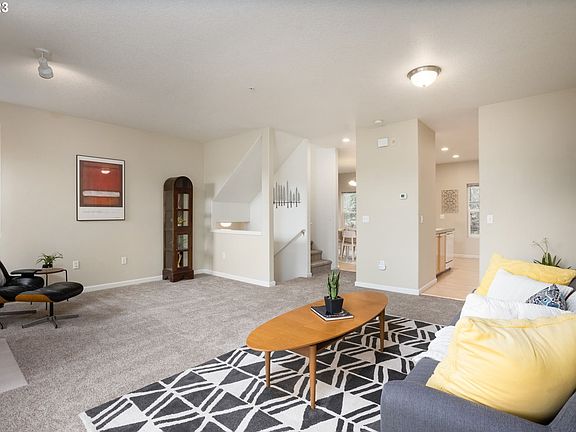 Great open floor plan, great natural light, peaceful setting, backs to trees. New carpet throughout. High ceilings. Kitchen features tile counters, pantry and eating bar. Dining area with slider to back patio. Primary bedroom with walk-in closet, private bath. Upstairs laundry. Two car oversized tandem garage with storage. Close proximity to Progress Ridge shopping & amenities including New Seasons, Big Al's, Cinetopia, and great restaurants. Great trails for biking/ jogging. Mountainside HS.