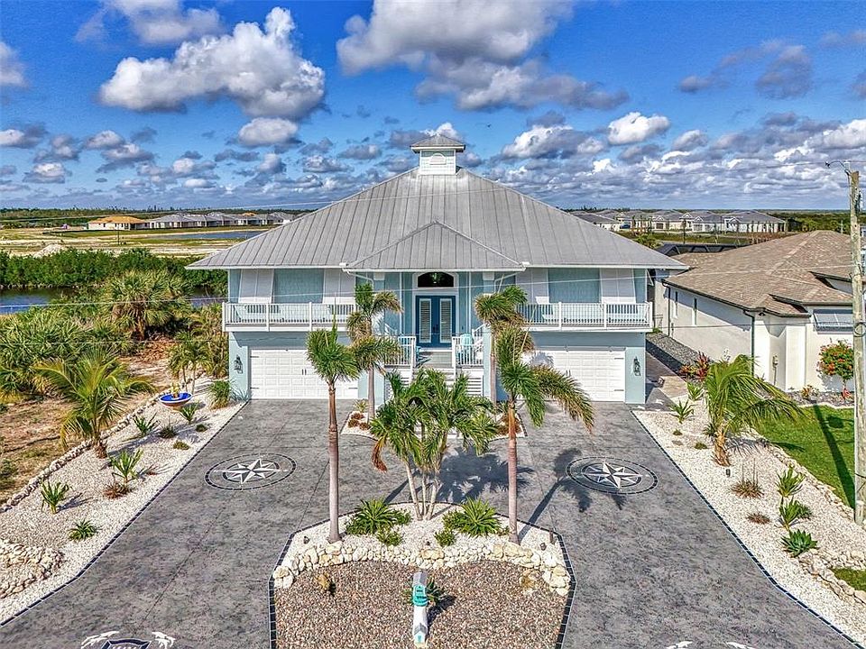 Custom Key West-Style Coastal Retreat designed with entertaining and coastal living in mind, this stunning two-level Key West-style waterfront home seamlessly blends comfort, elegance, security, and practicality. This 6,342 sq ft overall residence (4,186 under air) offers direct Gulf water access with no bridges, and is in desirable Section 93, having the closest proximity to the Harbor or the opportunity to explore South Gulf Cove’s 55 miles of canals. From the moment you arrive, you'll be captivated by the meticulous attention to detail, both inside and out. With a huge heated saltwater pool and adjacent spa, separate jetted and saltwater hottub, fabulous new poolside tiki hut, and canal-front hard scape area perfect for entertaining, you will feel as if you are in the Keys living the ultimate Florida lifestyle every day! Exterior features also include: All-new Hardie concrete board siding has been installed around the home, with Hardie ceilings also added to both upper and lower lanais. The metal roof has received a complete replacement of all fasteners (2024), for greatest protection and roof longevity. Fresh xeriscape landscaping surrounds the extensive hardscaping and stunning landscape lighting. A new (and huge!) composite walk-around dock includes a 13,000 lb boat lift with Gem remote. Built on a raised foundation, the home has a total of four oversized garage stalls, is fully conforming, insurable, and protected from storm surges. Brand new low-e hurricane impact windows and doors, key west-inspired bahama shutters, and screening on both lanais take your everyday living to the outdoors in comfort and style. With a new electric hurricane roll down shutter across the front door and rolling shutters on both rear lanais, you will have the utmost of security and protection of your entire home from the elements. Generator-ready electrical systems add an extra layer of security and convenience. Interior Features: Step inside to discover a meticulously redesigned interior with modern coastal elegance and custom detailing that make this home especially unique. A brand-new chef’s kitchen with an 8-burner gas range, large center island with waterfall quartz and matching backsplash, all new appliances, as well as an adjacent and well-appointed laundry/butlers pantry area provides extra prep space and storage galore. Exposed beams in the living room and kitchen, coastal-inspired shiplap accents, lanai stonework, new flooring and fresh paint, and custom foyer stair railings add to the one-of-a-kind custom coastal style. For added convenience and future flexibility, the home includes an elevator shaft currently used as additional storage. With a spacious but extraordinarily comfortable layout, this home is ideal for hosting family and friends, boasting four bedrooms and four bathrooms, with a downstairs bonus room perfect for entertainment or any custom configuration. The downstairs lounge is pre-equipped with hidden plumbing and electrical/laundry fixtures, offering endless customization possibilities. 15434 Margo Circle provides you the opportunity to live the ultimate Florida lifestyle, having the perfect blend of coastal style, entertaining possibilities, gulf access, the ultimate in outdoor living, security, and low-maintenance. *** Flood insurance policy is assumable.