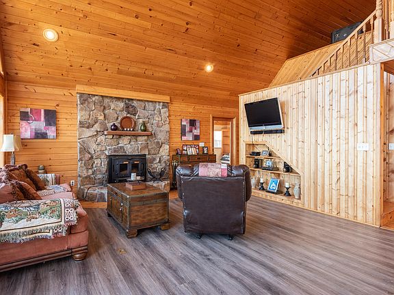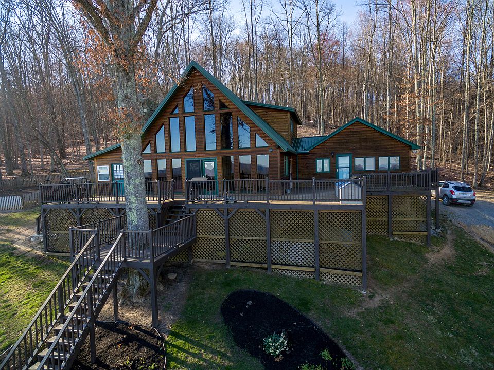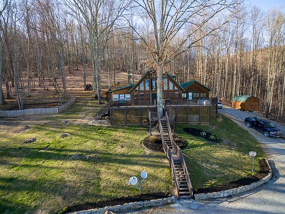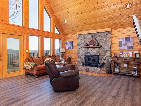 Experience views of two states and three counties from your living room at this log construction, A-Frame getaway perched atop Duffield, Virginia. The 3BR/2BA rustic retreat features a massive great room with 20ft. wood ceilings, wood-burning, stone fireplace and open concept kitchen/dining/living. The kitchen includes all appliances, a large pantry and bar area. The main level also hosts a sunroom with more mountain views, laundry area, two bedrooms and a full bath. Upstairs you'll find the master suite, complete with a fully renovated master bathroom. The recent remodel includes a tile step-in shower with glass enclosure, tile wainscoting on the walls, double vanities and linen closet. Views abound from the bedroom, as it looks out toward the A-frame glass windows. Outside, there are massive amounts of deck space to take in views of Kane Gap and even Bays Mountain in Tennessee. The 7.3 acre lot is cleared in the front and wooded behind the home. Wildlife is prevalent throughout the year on the property for admirers and hunters alike. Once the temperature heats up enjoy the long-range scenery on a float with a drink in hand in the above-ground pool. The pool is partially surrounded by a deck area. Rounding out the property is a one-car garage with work area at the bottom of the driveway, a storage shed and a renovated storage shed (with power) currently setup as a gaming studio. The space has finished walls, ceilings, flooring and window unit heating/cooling. This is truly a unique property with something for everyone