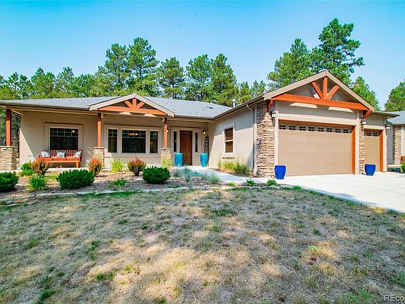 Tucked away in the private Black Forest Reserve neighborhood, you won't regret living here in the quiet serenity of Black Forest. The gated community adds to the sense of privacy and the large lot 2.5 acre lot is surrounded by trees. Enjoy the outdoors from the back patio and raised wood surrounded by plants and shrubs. The front is also nicely landscaped and with adorable covered front porch, this home offers excellent curb appeal. The exterior of the home showcases low-maintenance stucco and stone veneer combined with large stained wood timbers. The driveways are concrete and the drive leading up to the house is paved in asphalt. This custom ranch-style home boasts 3 bedrooms, 2.5 bathrooms, an attached 3 car garage, and additional detached 2/4 car garage/workshop. Hardwood flooring runs throughout the main floor into the open-concept living room and kitchen area. Cabinet space aplenty in this kitchen which also includes granite countertops, stainless steel appliance package, travertine tile backsplash, large island and pantry with roll-out shelving. Adjacent to the kitchen is an eat-in nook with walk-out to back patio. Cozy up to the gas fireplace in the living room, with full height stacked stone, stained wood mantle and stone hearth. Or, entertain family and guests in the separate formal dining space. Large master suite includes walk-in closet and HUGE attached bathroom with granite countertops, TONS of countertop and cabinet space and large walk-in shower. The two additional carpeted bedrooms are nicely sized. Laundry, full bath and half bath complete this home. House is equipped with alder cabinets, granite countertops, oil rubbed bronze fixtures, 10' ceilings and undercabinet lighting. The workshop is size 28x36 and has heat, electric and water hookups. There is an additional soaker hose for the gardens around the house!