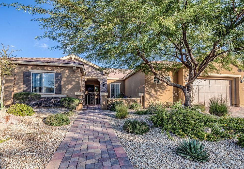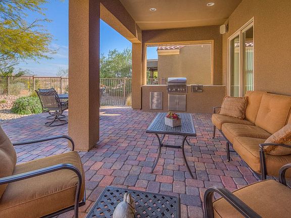 SIMPLY STUNNING...This 2,659/SF FURNISHED Primrose is located in Branding Iron, an exclusive gated community in Sun City Mesquite. Adjacent to the 13th green of the Conestoga Golf Course, this immaculate retreat is situated on a quarter acre of land on one of Del Webb's most sought after home sites. Enjoy panoramic views of the course, northern mountains and Flat Top Mesa. The yard is beautifully landscaped and the gated front court yard and covered patio have been extended with pavers. The gas fire pit, outdoor kitchen and speakers are ideal for entertaining. Expect nothing less from the interior. This TURN KEY, FULLY FURNISHED home is well designed and opens up bringing the outdoors in. The extended tile is laid on the diagonal and the paint tones are warm. The kitchen is accented with gorgeous granite, rich cabinetry and premium stainless steel appliances. This owner has added many costly upgrades since last purchased and the designer furniture package is just one of them!