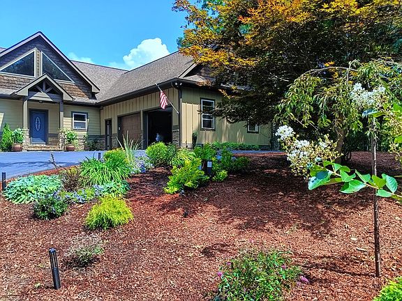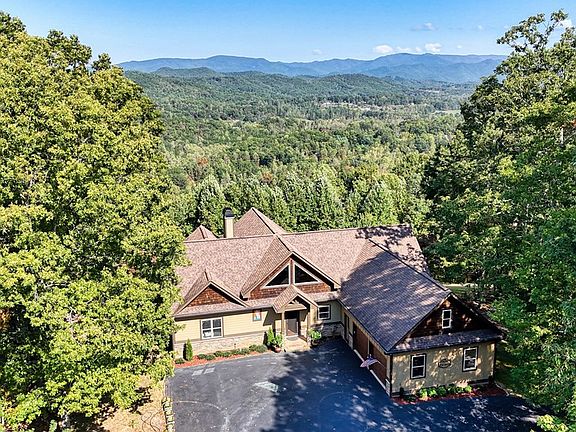 Craftsman style, detail & quality with incredible year-round views from this lovely mountain property! The heart of the home is anchored by the large 2 story living room allowing for multiple seating areas, a relaxing custom oak bar built by one of our local craftsmen and the adjoining granite and stainless kitchen with its large island for buffets or conversing with the cook! A separate dining room serves holiday feasts or could easily convert to a library or den for more casual living. Several open-air spaces bring the outdoors in while the vaulted ceilings, real hardwood floors, stone fireplace and huge views at every turn beg you to grab a book or, throw a party! The oversized Primary with beautiful bath, expansive views and star filled nights rests above the main via a custom wood and iron stair while the catwalk crosses to the guest room/office with half bath both floating above the downstairs living area. You'll find a second Primary tucked away on the main with another beautiful tile shower and grand bath with wooded seclusion. The attached garage is oversized and accessed thru the laundry/mud with level approach to the gardens encompassed by the circular drive. Add a bonus detached garage/workshop and/or storage space with electric and you're ready to go! Offered by the original owners this home is well planned and appointed with the perfect blend of low maintenance materials inside & out. Come enjoy the wonderful, relaxed feeling you'll get from living in the North Carolina mountains, close to town but miles from reality!