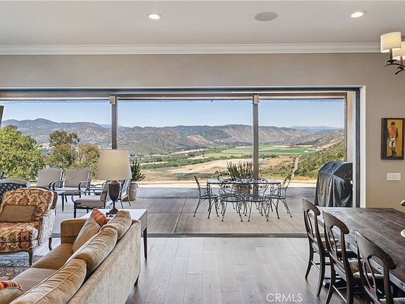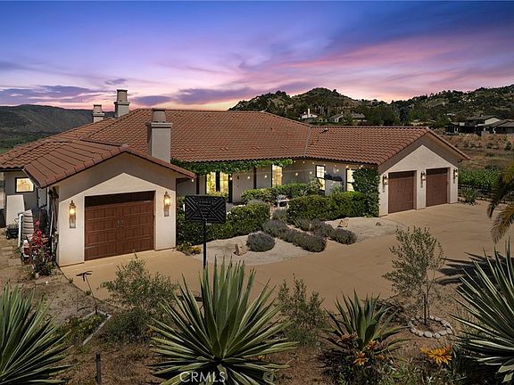Own a piece of paradise in this Highland Valley Wine Country single-level Mediterranean home. Situated on over 3 acres, it overlooks the San Pasqual Valley and Safari Park and offers beautiful sunrise views and stunning mountain and valley views including pastures, flower fields, and citrus groves. The expansive open floor plan features high ceilings and large windows that flood the space with natural light. The large great room features a stone fireplace, built in bookcases and cabinets, and a 20’ slider that tucks into the wall, opening your living space to a covered lanai which includes a fireplace and is wired for television and sound. The great room seamlessly flows into a gourmet kitchen which includes a large island, Subzero refrigerator, Wolf stove, under-cabinet dual zone wine cooler, and leather-finished granite counters with tons of cabinets; perfect for entertaining. There’s an enormous walk-in pantry and temperature controlled wine cellar with built in storage for 375 bottles, and room for more. The primary bedroom and bath feature great views, a huge closet, walk in shower, and large soaking tub. The other bedrooms are spacious and have views and walk in closets. The front courtyard features dining and sitting areas, with another outdoor fireplace and custom fountain. Enjoy your own established vineyard, enhancing the charm and appeal for wine enthusiasts. There’s also a grove with many fruit trees including lemon, lime, orange, tangerine, fig, pomegranate, guava, and 11 olive trees. Built in 2018, this home has many high-end finishes: 10’ ceilings, crown molding throughout, recessed lighting, hardwood floors, 8’ solid-core doors, soft-close cabinets, whole house fan, oversized 3-car garage space with work area, plenty of storage, and owned solar panels with two Tesla Power Walls. Conveniently located near shopping and schools, but with all the benefits of quiet country life. Best of all, this property has no HOA or Mello-Roos fees. This home has an Escondido mailing address, but is actually located in unincorporated San Diego County. Don’t wait, live the dream in wine country!