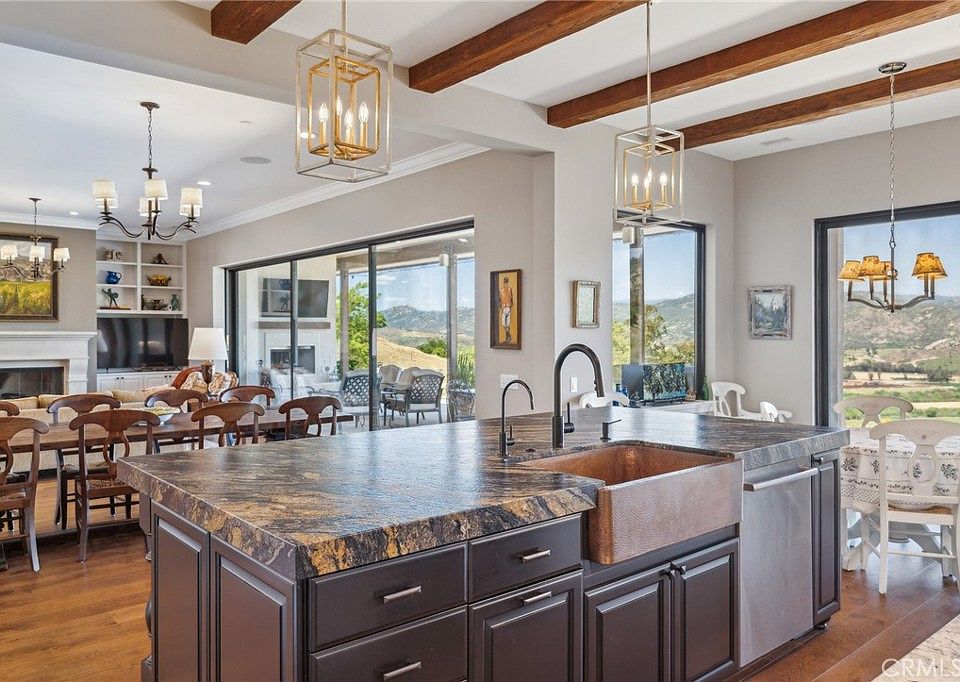 - Beamed Ceilings, Breakfast Bar, Built-in Features, Breakfast Area, Ceiling Fan(s), Crown Molding, Separate/Formal Dining Room, Granite Counters, Open Floorplan, Pantry, Pull Down Attic Stairs, Recessed Lighting, Track Lighting, Wired for Sound, All Bedrooms Down, Bedroom on Main Level, Entrance Foyer, Instant Hot Water, Main Level Primary, Primary Suite, Walk-In Pantry