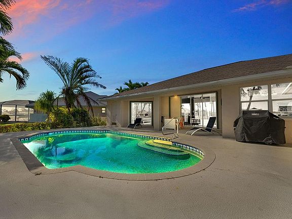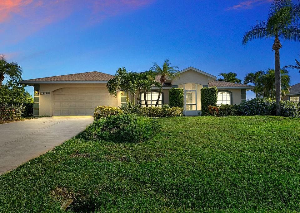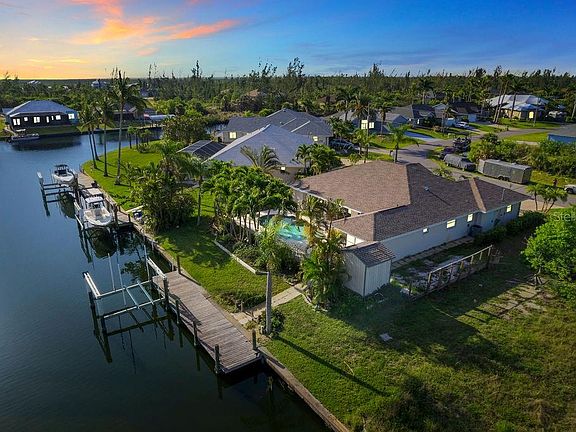 **NEW ROOF** Don't miss this opportunity to find your tropical oasis in a prime boating location only minutes to fast water in the popular boating community of South Gulf Cove. This spacious 3 bedroom and 2 bath single level home boasts nearly 2,000 square feet of living space. With a large open great room with vaulted ceilings, this home surrounds and flows seamlessly to your outdoor living on your large sparkling pool. Travel through the lush landscaping to your large private dock where your 10,000 pound boat lift awaits to head out on the water to catch tonight’s dinner. An eat in kitchen provides a comfortable space for the casual dinner for just the family while a spacious dining room provides room for entertaining guests in a more formal setting. A massive primary bedroom that’s 23 feet deep provides plenty of room while enjoying the view of your sparkling pool. Your guests will appreciate the privacy and space the split floor plan provides while enjoying views of the waterway and pool. Multiples upgrades made by the current owner: New roof incl. soffits and fascias (2022), new laminated floor in bedrooms (2023), new paint all interior (2022), new toilet (2022), new ceiling fans interior and exterior (2022), new kitchen and bath faucets (2022), new pool pump (2022).