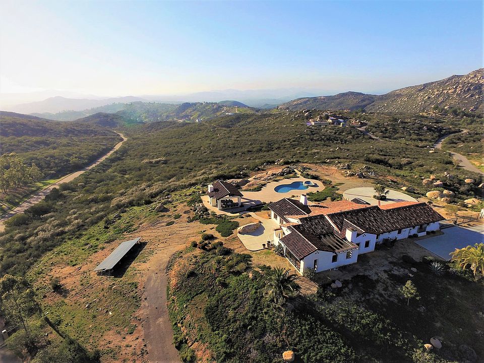 Prepare to be completely enchanted by this romantic and majestic custom home situated on 5.56 acres of total privacy in the hills of Poway. This desirable home boasts an expansive and exquisite indoor/outdoor living space with 360 degrees of endless views. Enjoy ocean views on a clear day and sunsets that are simply breathtaking. This is the perfect venue to entertain and enjoy the outdoor living area! This highly sought after home has a gorgeous kitchen that flows into the great room with built-in media wall, LED TV, masonry fireplace with custom iron door and amazing views. The kitchen features Sub-Zero refrigerator, Viking Convection Double-Oven, custom pull-out cabinetry, large pantry, sophisticated reverse osmosis system, hand painted Spanish tile for the back-splash, farmers sink and island bar. It also features a formal dining room and office/library with views in every room, so it is a true entertainers delight. Incredible interior design elements include brick barrel hallway with recessed art niches, Garrison Hickory Cider hardwood floors, Saltillo tile flooring in bathrooms and private courtyard, dark wood ceiling beams, wood casement French doors & windows, 3 masonry fireplaces with custom iron doors, hand forged wrought iron front door, gates and fixtures, beautiful master retreat, fireplace and private tranquil 576 sq feet courtyard with new Spanish fountain. Spa master bath with hand painted tiles and new walk-in California Closet. This exquisite gated property on 5.56 acre is the perfect venue to entertain and enjoy the extended outdoor living area with built-in barbeque, stone fireplace, half bath, outdoor shower, enclosed LED TV, and built-in surround speaker system or relax around the salt water pool/spa retreat and fire pit. In addition, the owners have invested $50,000 in a 10.0 kW Solar System and a new Well Pump/Motor System with 11,500 gal tanks that serve both the drinking water and landscaping. The drinking water goes through a very sophisticated water filtration process that is located in the SE corner of the garage. The 2-car garage has been painted with many added built-in cabinets and a circular driveway allowing ample parking space. For more details visit our: Virtual Tour at: www.previewfirst.com/vt/77345 and on this Aerial Video: www.s3-us-west-2.amazonaws.com/wittyaero/uploads/poway.mp4