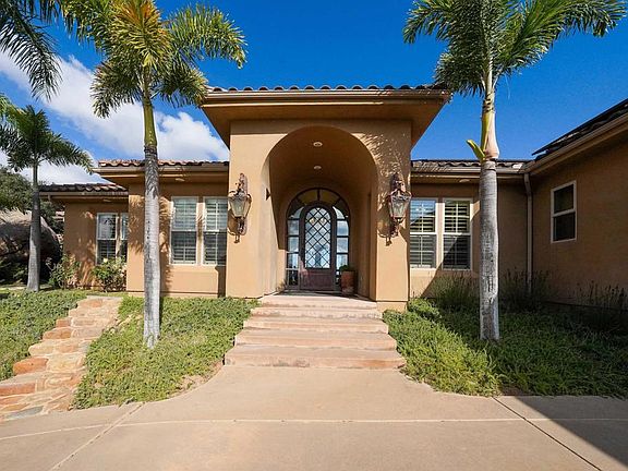 Perched on the coveted west end of Ramona, this estate's main residence, 3 bedroom 2.5 bath plus office, blends refined living with breathtaking natural beauty. Nearly 360-degree views surround the property, enjoyed from the dramatic 70' covered view deck or the newly crafted west-facing rock fire pit—an ideal setting for sunset gatherings as distant evening lights shimmer across the horizon. A grand Palladian glass and iron 10' entry door sets the tone for the thoughtfully curated upgrades throughout, including stamped concrete floors, new designer vinyl flooring, freshly painted baseboards, ceiling fans in bedrooms and family room, whole-house water filtration and softening, reverse osmosis, and fully owned solar with expanded panel capacity. The interior showcases alder cabinetry, 10-ft doors, and a chef’s kitchen appointed with Monogram and Thermador appliances, granite and stone finishes, and a warming drawer. An expansive island featuring a sink and ample space for everyday dining, “BeeHive” fireplaces add warmth and charm, while the butler’s pantry with wine storage creates an elegant flow for entertaining. The grounds evoke a private retreat with a flourishing mini-vineyard of approximately 350 vines, raised garden beds with drip irrigation, fruit trees include: orange, Meyer lemon, tangelo, nectarine, peach, and macadamia nut, and curated rock pathways that invite peaceful walks. Fire-safe vegetation management has been completed and continually maintained. A stunning detached 1-bedroom/bath guest house enhances the estate further, offering its own west-facing outdoor sitting area, an attached two-car garage, and dedicated laundry—ideal for guests, multigenerational living, or flexible use. Countless additional custom touches that must be seen to be appreciated.