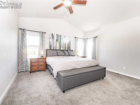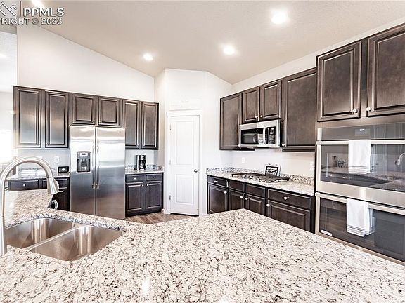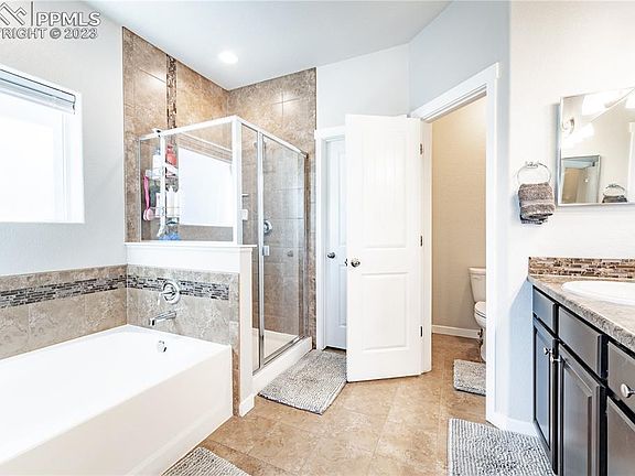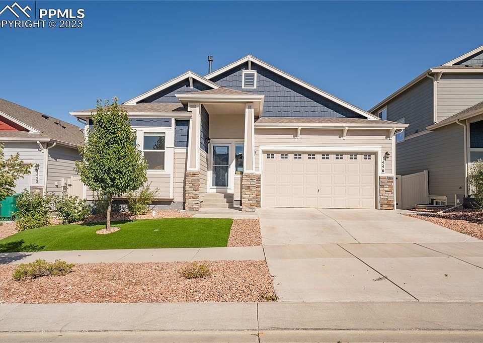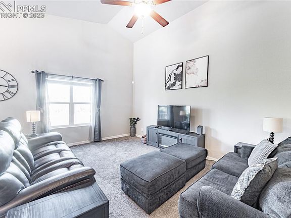 Welcome to this stunning 4-bedroom, 3-bathroom home, just 4 years young. Its contemporary design and timeless comforts create the ideal living space. The open-concept layout floods the home with natural light, perfect for daily living and entertaining. The huge kitchen boasts stainless steel appliances, granite countertops, and a spacious island, making it a chef's dream. Four generous bedrooms, including a master suite with an ensuite bathroom and walk-in closet, ensure restful nights for all. Plus, a functional office space. Energy-efficient features keep utility bills in check and sound dampening windows help you rest easy at night. The walkout basement offers a back patio and the main level has a deck, both with incredible sunset views of Pikes Peak and the Front Range. This home's prime location offers easy access to downtown, schools, major highways, and military installations. Meticulously maintained and move-in ready.