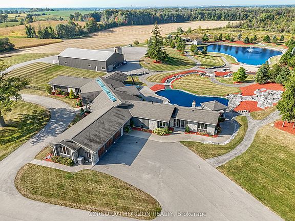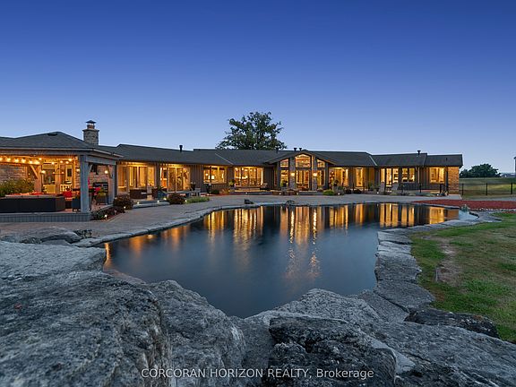 Experience an extraordinary retreat set on 122 acres of natural beauty. This custom stone bungalow, spanning 10,454.23 sq. ft., showcases high-quality finishes and thoughtful design. Step into the gourmet kitchen, equipped with Viking Professional appliances, Silestone Quartz surfaces, and striking Douglas fir beams. The dual islands invite gatherings, while the dining area offers seating for 14, overlooking a scenic ponds. High ceilings throughout the home create an open, inviting space, while the use of stone and wood details adds a warm, cozy atmosphere. Hand-chipped stone accents and skylights flood the interior with natural light, enhancing the home's connection to its surroundings. The primary suite opens directly to the swim ponds, offering indoor-outdoor living and a spa-like ensuite with a jacuzzi tub beside a gas fireplace. An indoor grilling area with heated floors offers year-round enjoyment, making it an ideal space for entertaining. The lower level is designed for fun and relaxation, featuring a full bar, billiards area, wine cellar, and a private cinema for movie nights. Outdoors, you'll find two ponds: one with a sandy beach and waterfall, and the other stocked for fishing. A heated, 4,000 sq. ft. exterior building with in-floor heating adds both function and flexibility to this expansive property. Explore the trails, unwind in the sitting areas, and enjoy this ultimate private getaway!