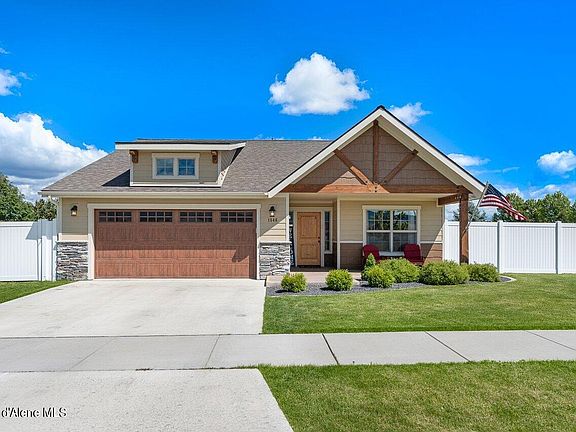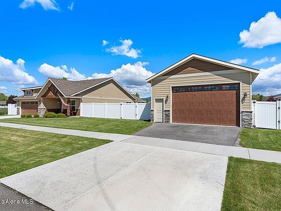 GREAT HOME WITH SHOP! Explore the charm of this single-story home featuring a 24x24 heated shop in a delightful neighborhood. Enjoy scenic views across from the community park with no neighbors across the street. This home is well-maintained, and offers an inviting open 'great room' concept with a kitchen flowing into the dining and living rooms. Huntwood cabinets, newer appliances, and a kitchen island enhance the space. The living room features a lovely stone gas fireplace, illuminating the gathering area with warmth. The backyard oasis includes a covered patio, perfect for relaxation. Professionally landscaped with brand new vinyl fencing, gates, lighting, and sprinklers. The large lot offers ample parking space for trailers or toys. Additional highlights include a water softener, soaking bathtub, central heating and A/C, and extra storage. Located near top-rated schools, restaurants, shopping, and 15 minutes to downtown Coeur d'Alene, 30 mins from Spokane airport.