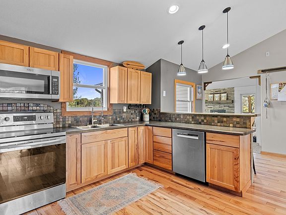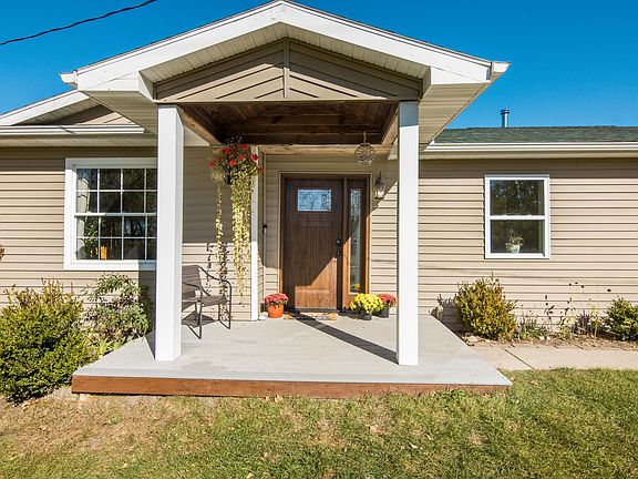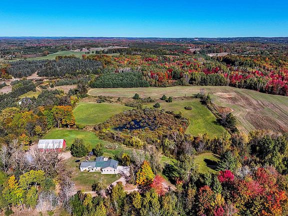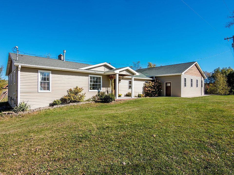 Welcome to your dream family home nestled in a tranquil country setting. This beautiful property features 3 bedrooms and 2 baths making it perfect for families or those who love to entertain. The large living room, has a stunning fireplace and cathedral ceilings. The patio doors lead you to a wrap-around deck that provides breathtaking views of the surrounding landscape. The updated kitchen has elegant hickory cabinets, high resolution laminate counter tops, and a large pantry. The bar eating area adds a casual touch. The combined kitchen and dining room has its own fireplace and quality hickory wood floors enhancing the warmth and charm of this home. The basement has many possibilities, featuring ample space for an extra family room or an additional bedroom area complete with walk-in closets and a full bath. The classic red barn is 64 x 36 providing great storage and cover for the horses/livestock. There is a garden shed, storage shed, and hoop greenhouse. Hunters this property provides deer, turkey, geese for all your hunting seasons. Don't miss the opportunity to make the beautiful home your own!