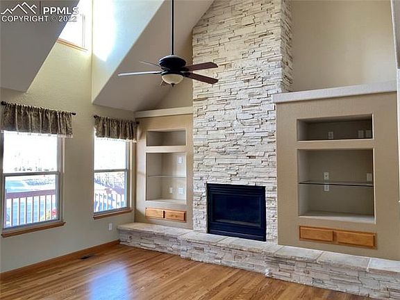 Stunning 4 bed, 3 bath, 2 Story home on a landscaped half acre lot. Private cul-de-sac street. From the covered front porch enjoy Pikes Peak views! Tons of natural light & neutral warm paint tones throughout interior of the home. A very spacious great room boasts a gorgeous stacked stone gas fireplace w/ raised hearth and gleaming wood floors and more of those Peak views. The dining room features built-ins & walk out access. Eat-in country kitchen with nice sized pantry & bay nook. Master bedroom suite conveniently located on main level, complete with a 5pc Master bath, walk in closet, tile floors, a dual sink vanity, jetted tub and tiled shower. Main level Laundry. There are 3 Bedrooms upstairs that share a Jack N Jill Bath. Do fun things in the upper bonus rec room/family room, with views & walk in closet. Keep cool with central air and ceiling fans. Dual water heaters and humidifier. Newer refinished wood floors flow through most of the main level. Beautiful front door with lead glass inset. The great room opens into the dining room and features a tray ceiling, pass thru to the kitchen, built-in cabinets/shelves and beveled glass French doors to the backyard deck. The kitchen has windowed cabinets with a lazy Susan. Stainless Steel modern appliances include a disposal, dishwasher, microwave, gas range and refrigerator. Bay nook provides for a more informal eating experience. There is a powder room on the main level. Main level laundry has cabinets. 3 Car garage with built-in storage. Pergala and sizable rear deck. Play set & raised beds. Endless opportunities to expand living space with huge unfinished basement. Located in the desirable neighborhood of Gleneagle. District 20 schools. Listing Agent is related to the Seller