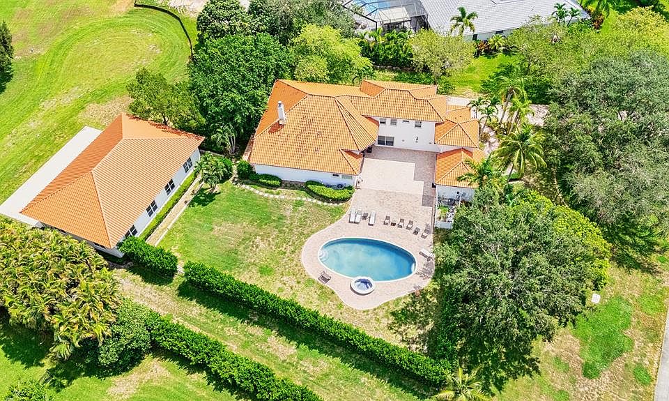 A rare aviation-ready estate in Wellington's exclusive Aero Club, this distinguished Mediterranean-style home spans 3,522 sq ft across a 1-acre, beautifully landscaped lot. Inside, discover 5 sumptuous bedrooms, 5.5 baths, soaring ceilings, tile and carpet flooring, a family room, fireplace, and a split-bedroom layout for modern comfort. The culinary kitchen features high-end built-ins, and every bath showcases contemporary, remodeled finishes.Step outside to your private paradise: a gated 20 40 pool with an 8-ft spa, and a separate cabana guest house with 1 bed/1 bath--perfect for visitors or flexible living. Car aficionados and aviators alike will delight in the oversized 3-car garage, sprawling driveway, and most uniquelya 60 +u 40 hangar with a 52-ft opening, plus access to a 4,000-ft paved jet-capable runway and helicopter clearance.