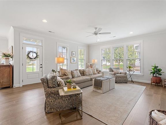 Welcome to the epitome of easy living in the sought after Villages of Brookberry Farm. This sun filled home has upgrades galore including wide plank hickory hardwood flooring throughout the entire house. 9 foot ceilings, gas fireplace, crown molding and built-in shelves welcome you into the great room that opens to a bright and airy kitchen with oversized quartz island and stainless steel appliances. Designer fixtures and details are evident in each room. Spa like master bathroom and private ensuite patio overlooking greenspace. Charming and private courtyard with fence. Plenty of storage throughout. Enjoy Brookberry living: pool and snack bar, clubhouse, lake house, playgrounds, fitness facility, barn, tennis and bocce courts. Professional photos coming Thursday.
