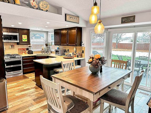 Charming home in SE Boise with a huge backyard, pergola patio for entertaining with freshly painted exterior. The fence has been painted within the last 18 months. This spotless, updated home has a three-car insulated garage with epoxy flooring and quiet DC garage door openers with WiFi. There is a NEMA 14-50 EV outlet in the garage. Downstairs there are two living areas, the kitchen tile floor is heated, quartz countertops, newer appliances, and a large pantry. The gas fireplace in the family room has a custom mantle and under the stairs tucked in a closet is the perfect private reading nook or storage area. The HVAC has 2 stage dual zoned air and heat with a Nest controller and nest smoke detectors.