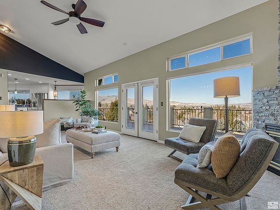 Stunning, one-of-a-kind home in The Highlands, one of Southwest Reno’s most sought-after neighborhoods. Attention to detail is apparent upon entering, where you’ll be awed by spectacular city and mountain views from the large, sunken living room, dining room, and heavily upgraded eat-in kitchen. The kitchen remodel features high-end appliances, including a Thermador Freedom induction cooktop, two dishwashers, updated cabinetry, granite countertops with large island and breakfast bar,, and walk-in pantry with custom barn doors. Multiple doors lead to the expansive deck, which overlooks the city. The primary suite is a true retreat, with beautiful, vaulted ceilings and an abundance of natural light, large sitting area, double-sided gas fireplace, jetted tub with skylight overhead, and additional access to the deck. Also on the main floor are two additional bedrooms with a full Jack-and-Jill bathroom, half bathroom, and laundry room with utility sink. Downstairs, you’ll find an additional 2704 square feet of living space, where the possibilities are endless! This space features a large bar/kitchen area, complete with gas range, vent hood, wall oven, and sink, and a living/dining area with French doors leading to the back yard, as well as an adjacent bedroom with separate entrance and fully remodeled bathroom. Grab your favorite bottle from the climate-controlled wine closet before making your way down the hall to yet another large bedroom with sitting area, freestanding electric fireplace with wall thermostat, and separate entrance; an excellent choice for an in-law suite or a separate residence. A sizeable bonus room completes the lower level, and could be the perfect home gym, man cave, office, craft room, or home theater. This home has been meticulously maintained, and no detail was overlooked. Other features include custom, solid wood interior doors, new light fixtures and paint throughout, lighted paver driveway, updated flooring, and so much more. Ask your agent for the additional features sheet. This remarkable home is priced to sell, and won’t last – make your private showing appointment today!
