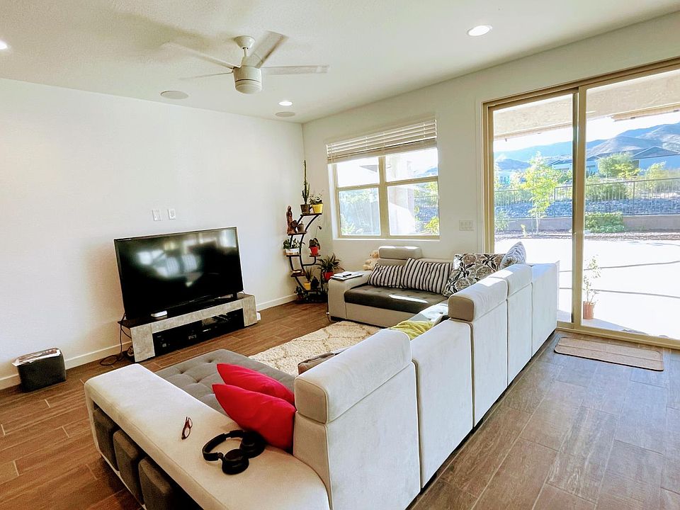 Single level house with an excellent view of South Mountain from the backyard and the great room. Built-in 2022, this beautiful contemporary 4 bedroom, 3 bath, with large great room, and game room is located in the Dobbins Heights gated community. Close to Charter, Basis, Math & Science Academy schools, and the highly-rated Vista Del Sur School. Very open floor plan, with a large spacious great room, large game room (can have pool table). Tile flooring, with carpet in the bedrooms. Kitchen has quartz countertops, a large island, dining area, gas range, stove-top microwave, dishwasher, refrigerator, pantry, and upgraded cabinets. Larger master suite with walk-in closet, double sink vanity, large shower, quartz countertops in all bathrooms, and separate laundry room. Whole house water-softener and RO system for drinking water are installed. Finished two-car garage with overhead racks. The property has landscaped front and back yards, focused lighting, travertine pavers, covered patio, shade & fruit trees, vines, flowers and bushes. You will not want to miss this one!! Please note that credit and background checks will be performed! Prefer a family that likes plants/gardening. Renters pay for utilities