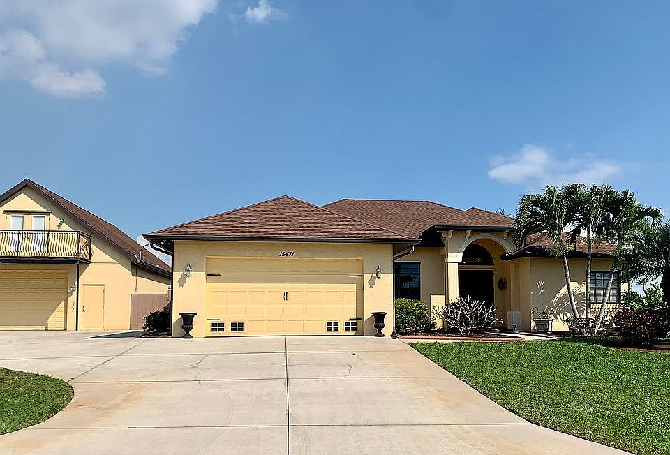 Located across the street from a canal and only 1 block from a coastal waterway, this beautiful home is nestled on 1 1/2 lots on a quiet, well-maintained street. It is customized with multiple upgrades, including a double entryway, 10’ ceilings, 8’ solid doors, tray ceilings in the formal den and dining areas, crown molding, a raised dishwasher and granite countertops in the kitchen, a central vacuum system, and an alarm system. The custom wood and tile flooring combination in the living area offers a warm welcoming feel. Multiple sliding doors at the back of the house offer views of the lanai from multiple rooms, allowing you to bring the outdoors inside. You can also walk out onto the screened lanai to enjoy the heated saltwater gunite pool, which offers an option for a relaxing waterfall or massaging jets in the seating area. The master bedroom contains beautiful hardwood floors and is secluded on one side of the house, offering privacy and solitude. The master bathroom includes a Roman shower with floor-to-ceiling travertine tile, a jetted tub for those relaxing moments, dual sinks, and a separate water closet. The second and third bedrooms are located on the opposite side of the home and share a bathroom with a sizeable walk-in shower, plenty of counter space, a wall-to-wall mirror, and dual sinks. A fourth bedroom is located at the back of the house and has its own bathroom, as well as its own access to the lanai. In addition to an attached 2-car garage, this home also includes a spacious 1,500 sq. ft. detached garage with an extra side garage door entrance, allowing for sufficient additional parking, storing personal watercraft, or incorporating a workshop. This building features high ceilings and has it own ½ bath. It is also plumbed for an outdoor kitchen if desired. The side driveway offers additional parking for a one-bedroom/1 bath guest suite located above the garage. With its own private stairway entrance, it is perfect for guests who prefer their own space, that coveted man cave/she shed, a designated game room, or an isolated office area for working from home. You can also open to double doors to enjoy the fresh air or step outside onto the balcony to enjoy that morning cup of coffee or view the beautiful evening skies. The flowerbeds are outlined with concrete curbing for a finished look, and the built-in sprinkler system makes watering the lawn a breeze.