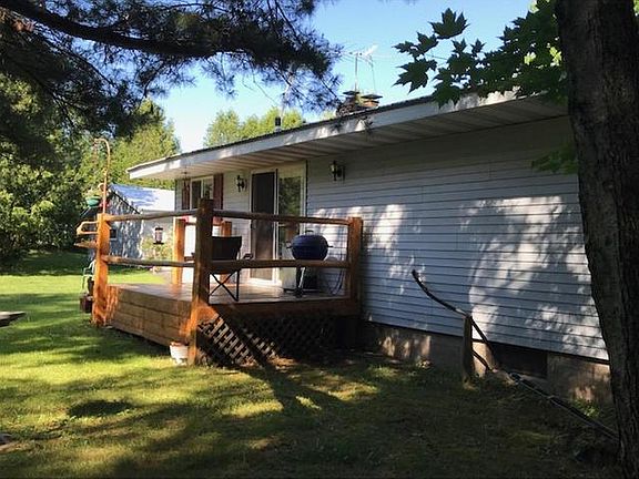 WOW... this well kept home sits on 6.5 beautiful wooded acres! 2BD, 1BA home has partially finished full basement, Huge dinette overlooks backyard deck. wood burning masonry fireplace in living rm. Loads of closet space. 1st floor laundry w/basement hookups too. 200 amp service, Large 24x36 detached garage & heated/insulated 30x40 pole bldg. Blacktop driveway. Yard is very private yet still close to town. ATV & snowmobile from your door. New windows, siding & steel roof in 2014. Outdoor woodburner incl too! Don't miss this one..
