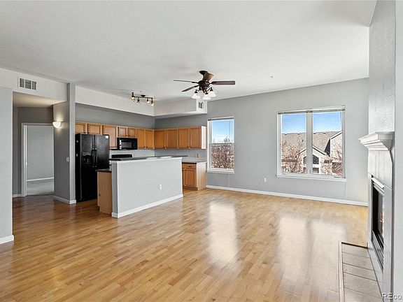 Welcome to the largest two bedroom, two bathroom floor plan at Towne Square Lofts! This quiet and private corner-unit with two exposures facing south and west has an oversized balcony just off the primary bedroom and living room. The large primary bedroom features an en suite bathroom with tub and walk-in-closet. The open kitchen with center island, breakfast bar, and dishwasher is framed by a wall of windows and offers plenty of cabinet and countertop space for cooking and entertaining. The second bedroom is secluded from the main bedroom for maximum privacy with an attached tile bathroom. Highlights include a washer and dryer in-unit, gas fireplace, central AC, tall ceilings throughout, elevator building with secured entry, two deeded parking spaces, gated/secured garage on ground level, extra wide hallways, hot tub access, and nearby private community lake. Conveniently located near Denver International Airport (DIA) and UCHealth University of Colorado Hospital (UCH) with easy access to I-70, I-225, and E-470. HOA dues include everything except electricity! Pets and rentals allowed.