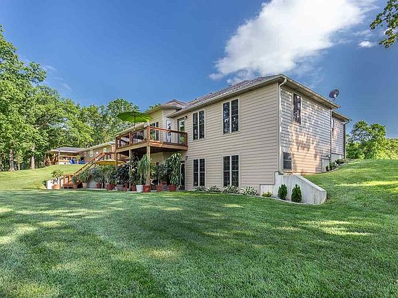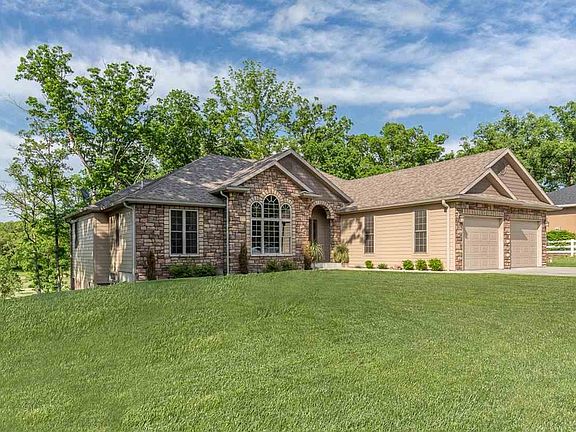 This 4 Bedroom, 3 Bath Ranch is on 1.3 acres overlooking holes 2 & 10 at Triple Creek Golf Course in Cole Camp. Features included are 10' ceilings on main floor, 9' basement walls & hand scraped teak floors. Gas fireplace in basement family room along with custom cabinets & wet bar. Two 2 walk-in tile showers (doorless), large walk-in closets, whirlpool tub & heated ceramic tile floors in master bath. Surround sound in living area & basement, ground source heat pump, 22,000 kw back-up generator, concrete approach in front of garage, hardi board & stone exterior, covered porch & concrete patio. Beautiful home!