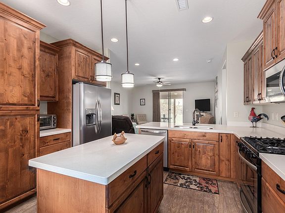 Wonderful opportunity to live in a nearly new home very close to town, in the very desirable subdivision of Eagle Ridge without a HOA. This light and bright charming home with 9' ceilings and 8' doors has an open floor plan 3 good sized bedrooms. The eat in kitchen has Quartz counters, S/S appliances, and custom cabinets. Fenced backyard with views of the SF Peaks from the covered patio.