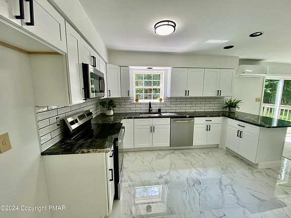 'Property is Under Contract and considering back-up offers only at this time.' Beautifully renovated Colonial home with 4 bedrooms and 2.5 bathrooms. Features include a new kitchen with marble countertops, stainless steel appliances, updated bathrooms with tiled floors and vanities, and luxurious vinyl flooring throughout.There are 5 new split units installed. The home also has a one-car garage, new roof, paved driveway, and a spacious deck overlooking a flat backyard perfect for entertaining. An unfinished attic offers potential for customization. Located in a vibrant community with a clubhouse, pool, and sports courts. Call today to schedule an appointment and move into the beautiful Poconos!